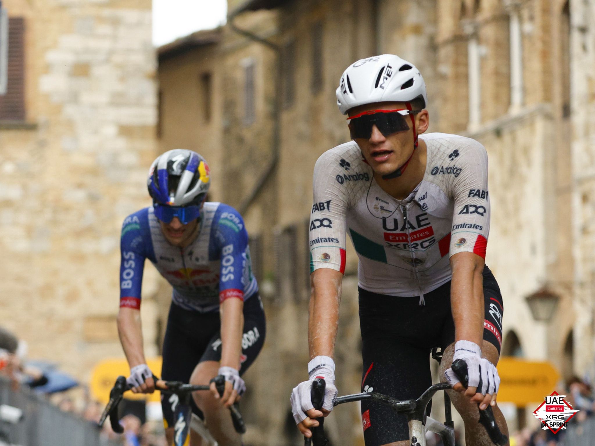 Despite the difficult terrain and pressure from behind, the trio worked together into the historic hilltop finish in San Gimignano. In the uphill sprint to the line, Van der Poel proved fastest, taking the stage victory ahead of Del Toro and Pellizzari, but Del Toro’s solid ride in yesterday’s TT puts him into the lead in the general classification.