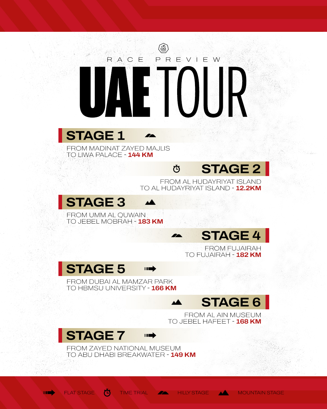 Finally, the UAE Tour will draw to a close with a pan-flat stage from Abu Dhabi Zayed National Museum to Abu Dhabi Breakwater on stage 7. Before all eyes turn to the last sprint of the race, landmarks on the route will include the city landscape of Abu Dhabi, Yas Island, and the Yas Marina Formula One Circuit.