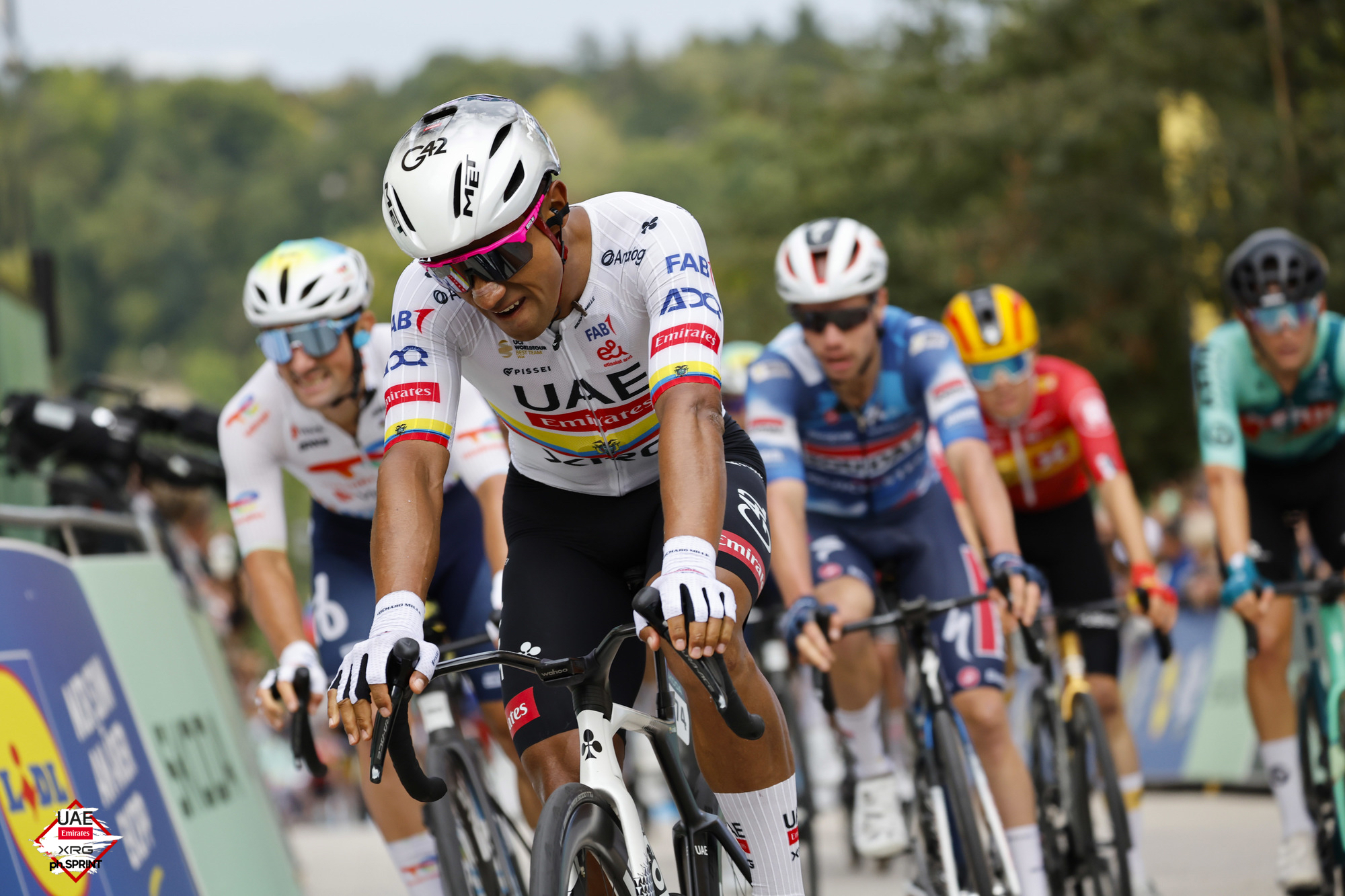 Ecuadorian national champion contests uphill sprint to the line in Luxembourg City, with Brandon McNulty well placed by teammates on final climb