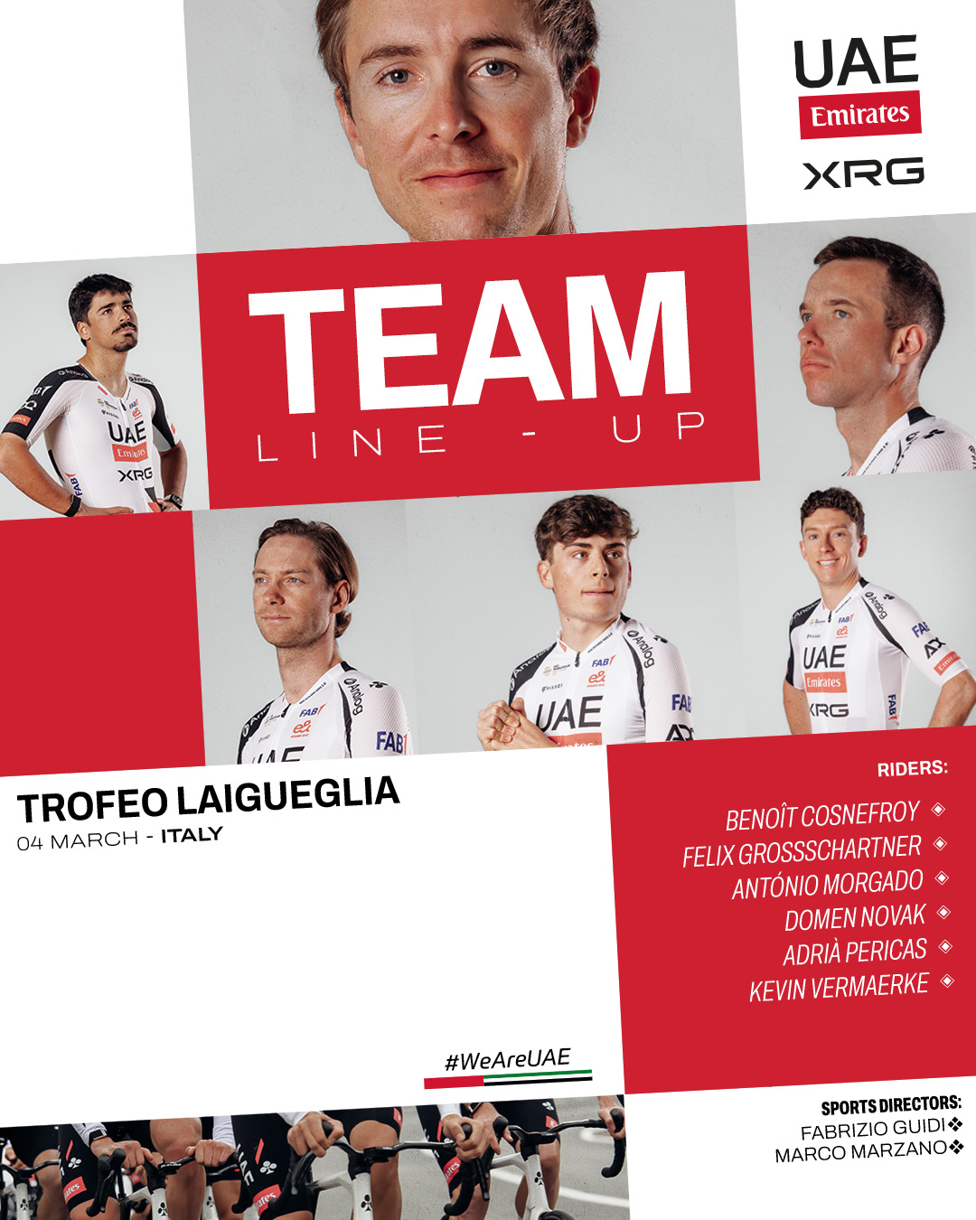 So it is that Sports Directors Fabrizio Guidi and Marco Marzano head up a team full of potential protagonists, with the experience of Benoît Cosnefroy, Felix Großschartner, Kevin Vermaerke, and Domen Novak complemented by the youthful exuberance of Adrià Pericas and António Morgado.