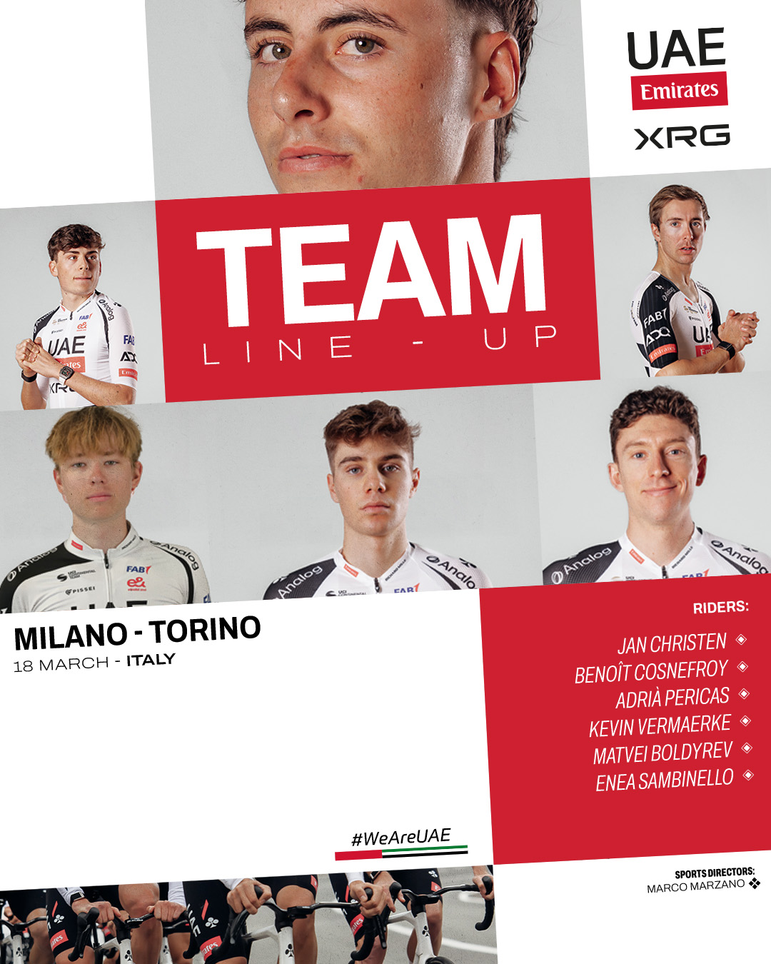 Sticking with Italy, for the moment, the Emirati squad will send a six-man squad to Milano-Torino on Wednesday, 18 March. Here, Jan Christen and Benoît Cosnefroy will be heading up the team’s hopes of defending the title won by Isaac del Toro last season.