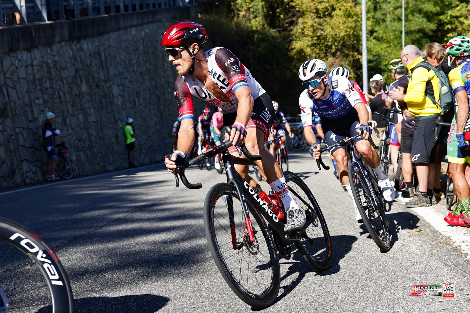 UAE Team Emirates were ever-present in the attacks with Alessandro Covi and Marc Hirschi making-up an elite seven man breakaway which held a slender lead over the peloton right up until the final 10km. This group would come back together on the flat run-in to the line with Trentin just off the podium in the final gallop.